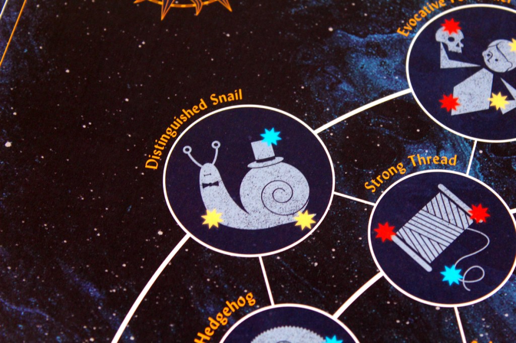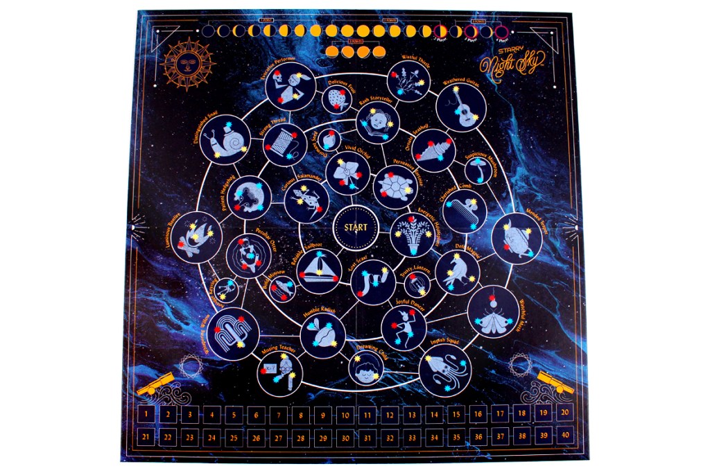 Overall, I think Starry Night Sky is a really great game! I love space and astronomy-themed games, and this one obviously caught my eye right away. What a beautiful box. It reminds me a lot of things I like about Ticket to Ride, but it’s a bit more semi-cooperative in nature. Here, you’re not building routes so much as you are shrinking the game board. It’s really interesting! After a few rounds, it’s very easy to get just about anywhere. The key is, to fill in those spaces, you have to spend Star Tokens (and get points), but that might be helping other players fill out their Myth Cards (especially at four players). I think that’s kind of fun, though! You never know who you’re helping. The Exploration Cards add a nice bit of variety to the mix, offering mid-game challenges and incentivizing players to do things that might not always be aligned with their overall goals in the hopes of gaining more points. I particularly like that you can just dump the goals for a free Star Token of your choice, as well; it fits some strategies a bit better. All the tokens do make the board a bit busy, though; it can sometimes be hard to see empty spaces (and I worry that jostling the board can prove disastrous, since the Star Tokens are just free-floating). That said, Emma Larkins is proving to be a master of approachability and vibrant game design, and Starry Night Sky is an excellent title in that regard, even if it’s a bit lighter than my usual playing fare. If you’re looking for a game that’s approachable and fit for a wide audience, you’re a fan of stars and constellations, or you just want to see a delightful snail with a top hat, I’d definitely recommend checking out Starry Night Sky! I’ve really enjoyed it.