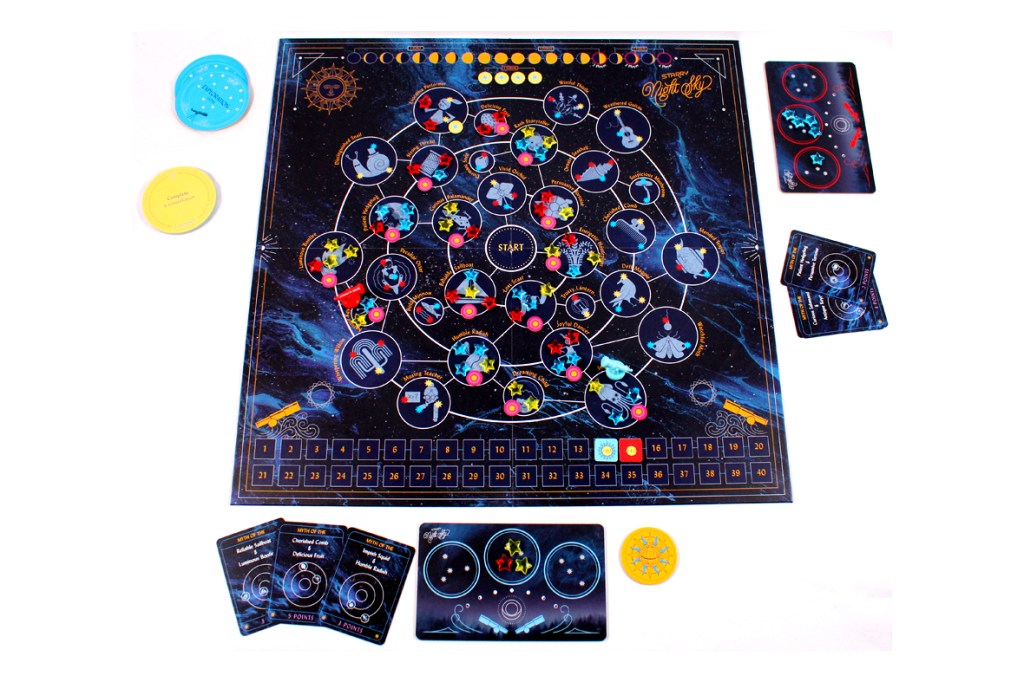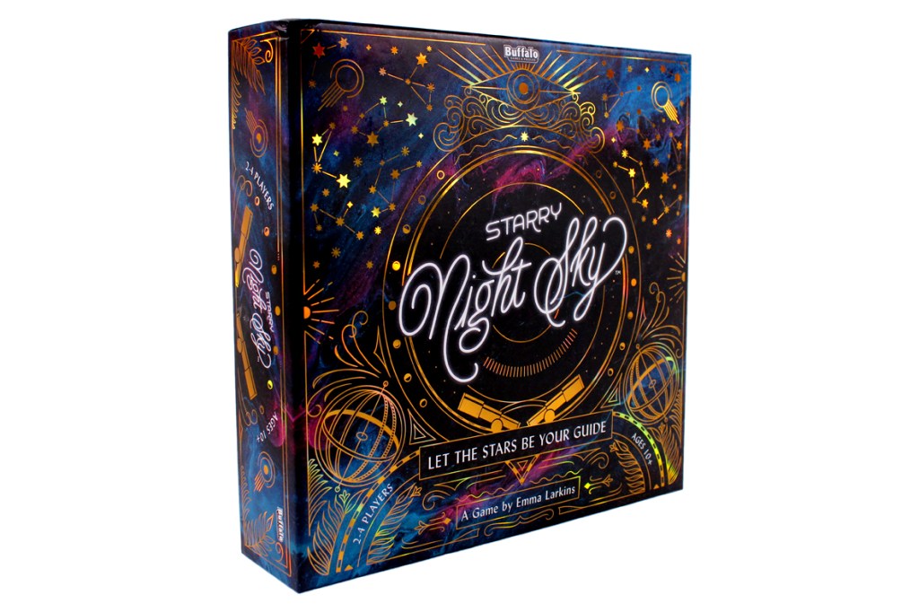 We’re really coming down to the wire here with reviews! I think I have two more games’ worth of photography (maybe three) before I need to disassemble my photography studio and start packing for real. Something to focus on this weekend, I suppose. In the meantime, this means that you can rest assured that the games I’m telling you about in this time period are games that are particularly interesting, new, or compelling; otherwise, I’d just have waited. This latest one is a new title from Emma Larkins, designer of Abandon All Artichokes! I’ve had my eye on Starry Night Sky for a while; let’s see how it plays!