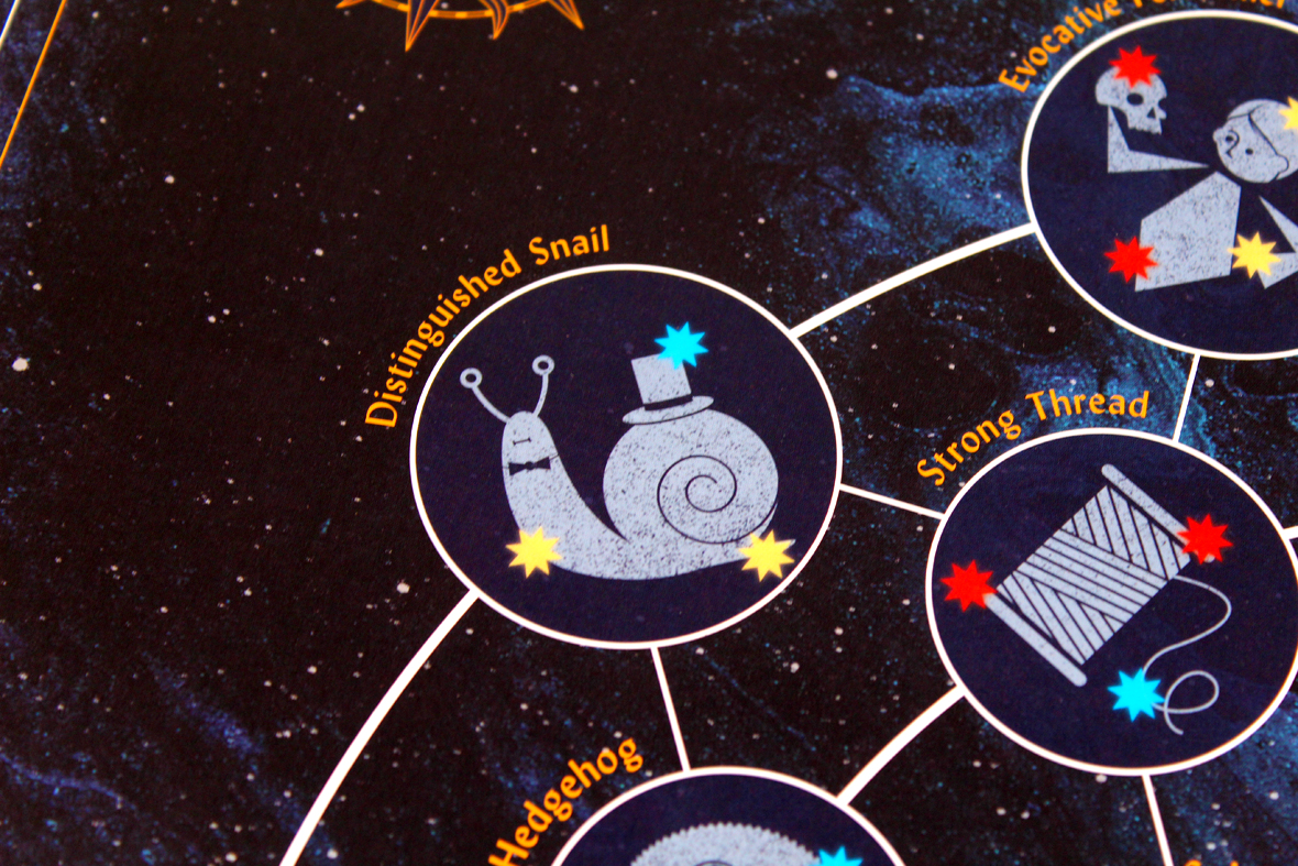 Interestingly, I noticed that fewer players tends to make the game a bit swingier than more players does, which runs counter to my usual expectation. With fewer players, you have to be a bit choosy about which constellations you go after. There aren’t enough for everyone to discover everything, so you’ll likely end up in a spot where plenty don’t get discovered. You still get plenty of points for the ones you discover, but, unfortunately, you run the risk of your Myth Cards going a bit more unfulfilled (since there won’t be as many players randomly filling out your constellations for no real reason beyond points for them). Plus, with more players, the network tends to get fuller faster, so it becomes easier to go after the constellations you want. Just an interesting note. This means that it’s more critical to go after your high-value Myth Cards, to some degree, and make sure you lock those down. With more players, more of your Myth Cards are likely to get filled out, so you’ll generally see more points (and less variance as a result). Just an interesting math outcome; doesn’t necessarily affect my enjoyment of the game one way or another. That said, with more players, the Distinguished Snail is more likely to get filled in, and he’s my favorite, so I’ve gotta lean in that direction.