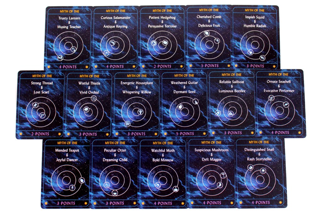 Once the game ends, players score their Myth Cards. A Myth Card is scored if both constellations on the card are fully-mapped, even if they were mapped by other players.