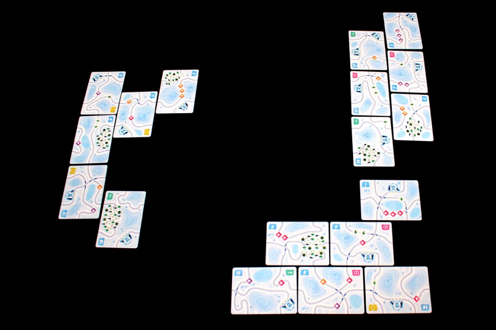 My general vibe is probably keeping this in the one- or two-player space. What I like about Super Slopes is building a big route and scoring a ton of points while trying to navigate placing what I need to place where. With more players, you have access to more cards over the course of the game, which naturally leads to more interesting paths and higher scores. At three, you only get six cards each, which, while fun, tends to keep scores pretty low. If there were more cards I probably wouldn’t have an issue with three players at all, otherwise. One nice thing that three players does is mix up who is taking what from the central column, giving you a wider array of options on your turn. I like that a lot. The solo game, on the other hand, has the “AI” just choose the lowest-numbered available card and total up points based on available symbols and energy. Still fun, but a distinct challenge (and you can give the AI extra turns to make things harder). No big preference otherwise, I just wish there were more cards for higher player counts.