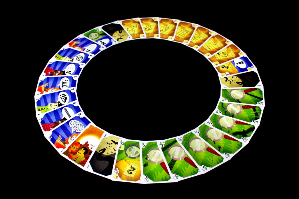 Now, the trick-taking starts! The start player leads with a card and then every player must follow suit by playing a card of the same color (cards with multiple colors are fine). If someone leads with a 1, all players can play any card that they want.
