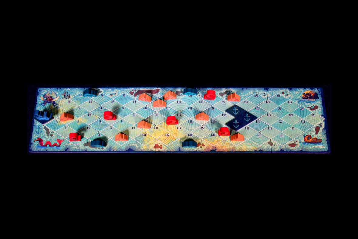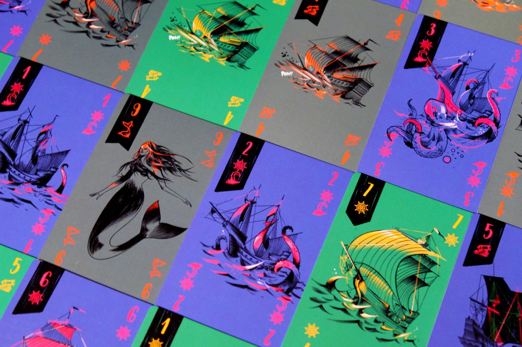 Both players set their Tricks Won counter to 0, and set the Round Tracker to 1. Place the Ship Token on the Start token. Next, set up the decks. Remove the 1s and 2s, shuffling them and placing them below the Kraken Deck spot with the Kraken Card on the bottom. Shuffle the other cards and deal each player nine: