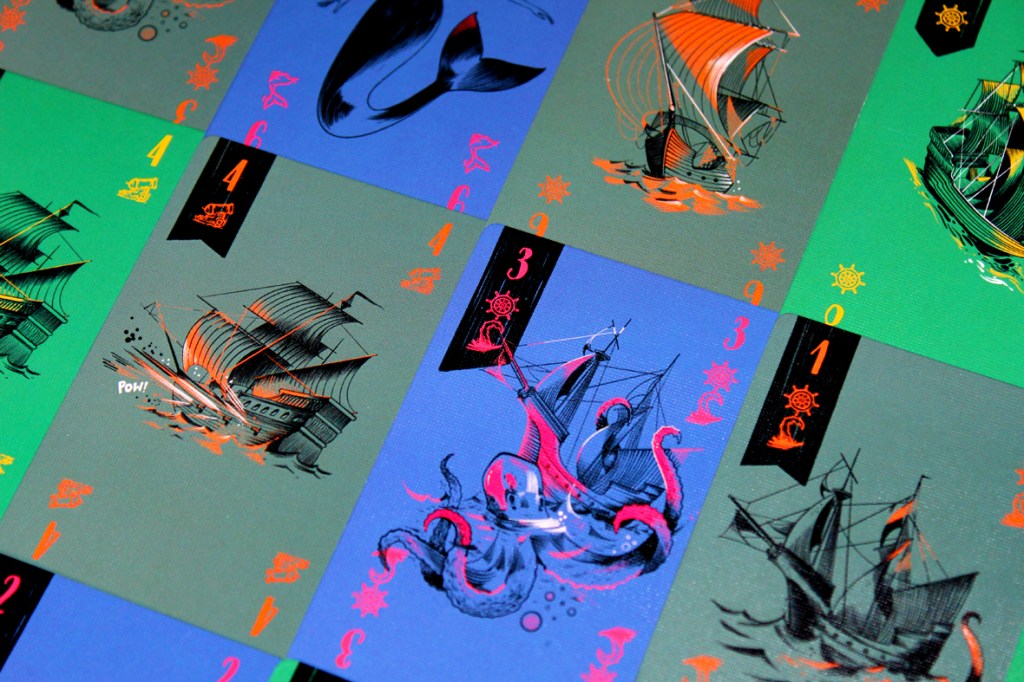 To start a round, each player gives the other player a card from their hand at the same time. Each round is made up of a series of tricks. Here, however, one player leads and the other follows, and that’s it. The two cards played can trigger an action in certain combinations. For instance, two cannons has you draw the top card of the deck and execute its ability, or two whales lets you move the ship forward. If there’s no matching action, nothing happens, but if you match up a Kraken tentacle or two, you might get attacked! When that happens, you’ll add cards from the Kraken Deck to yours, gradually making that deck smaller. If it runs out entirely, you’ll lose!