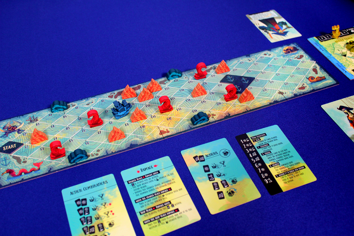Your goal in Sail is to make it to the finish! Avoid storms, take tricks, and use your pirate abilities to navigate various challenges over up to five rounds.