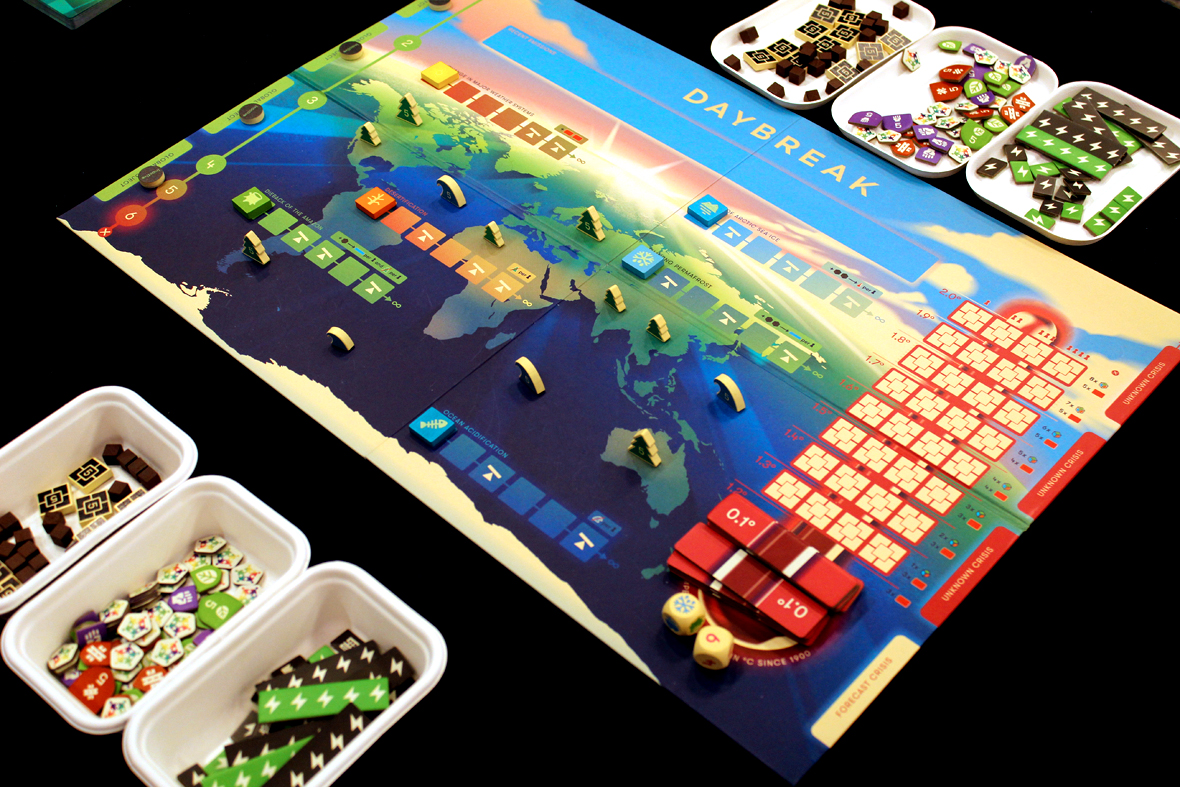 In Daybreak, players take on the roles of various world powers, trying to fight off global heating and protect their citizenry from the various consequences of global heating throughout the game. You’ll need politice, technologies, and each other if you want to successfully sequester some carbon and start drawdown. Will you be able to clean up all of your dirty energy?