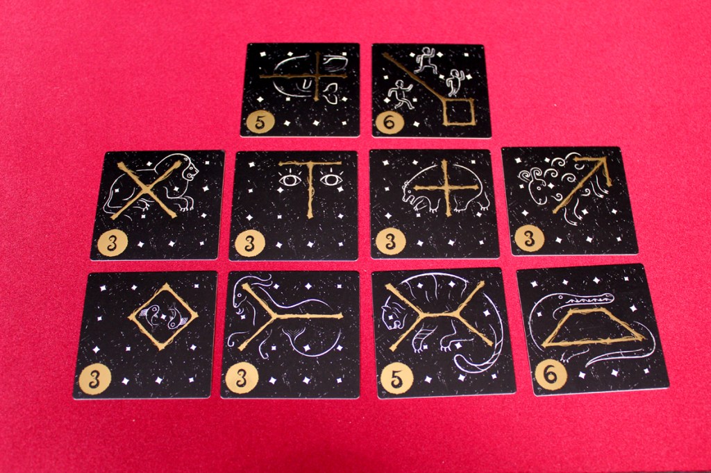 Creating shapes pictured on Bonus Cards may offer you extra points or abilities! Note that those shapes can be part of larger constellations; they don’t have to be entirely distinct. You just can’t use the same pieces of a shape to activate a Bonus Card multiple times.