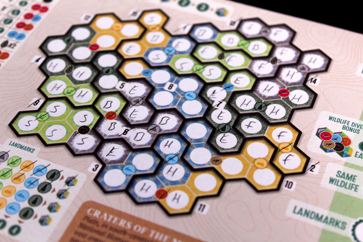 - I think the D board here is less complicated than but just as interesting as the D board in Rolling Rivers. Just a little less complicated, though, since you’re trying to fill out various hexes with the same animal type rather than trying to make specific arrangements of the various animals.