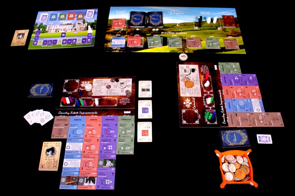 At various player counts, you’re going to find some things easier and some things more difficult. There are some balancing choices made by the game, for instance, making sure that there are sufficient staff at each player count so that you’re not running out of Valets or Lady’s Maids. But other things stay constant, like the size of the Building Market or the number of tiles of each type. This means if you’re looking for a specific tile, you might be out of luck, and if the specific point type sought by the Fairchilds is different every time, player specialization may make it difficult for you to successfully court one multiple rounds in a row. While one could make the argument that this makes higher player counts more interesting, I think it’s easy to keep two-player games plenty engaging, especially with some of the available variants (refreshing the Builder’s Market more regularly or changing up Courtship at the last second) available in the rulebook. From a space constraints perspective, it’s a bit easier to play on a standard table with two players, granted, but you can still do your posh accents or roleplay if you want with more folks; you’ll just need a bigger table. I wouldn’t say I have a huge player count preference, as a result. If you play with the more aggressive / take-that cards, though, then I tend to prefer two-player games.