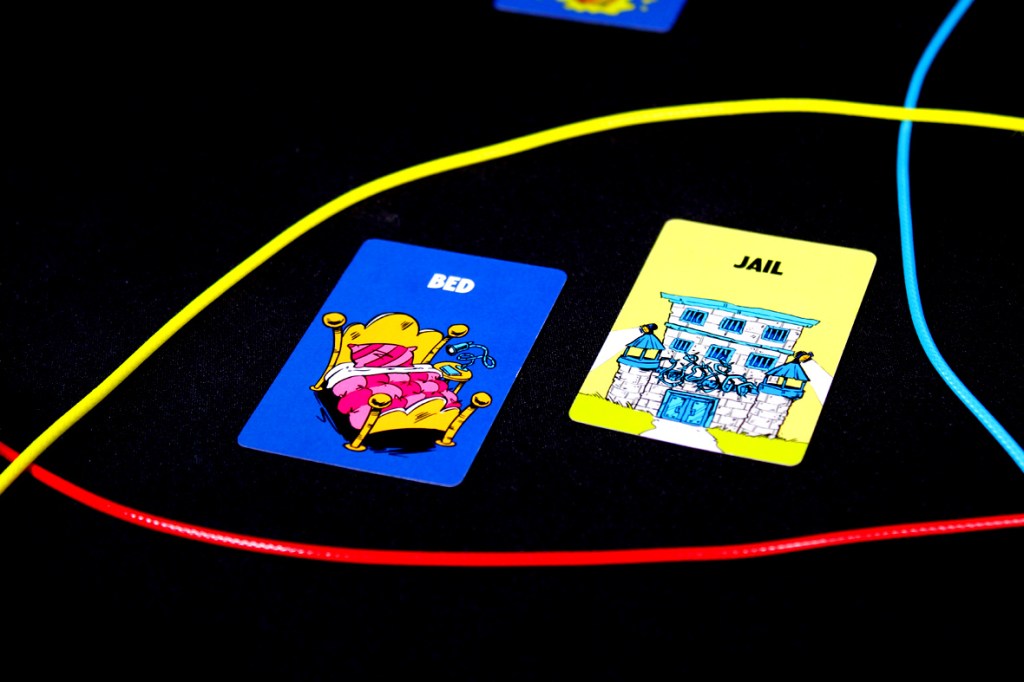 - The rings are appropriately-sized, though you may have to stack cards in some of the overlap spaces. If the rings were larger they’d barely fit on most tables, and the cards are small cards as-is, but especially if the round takes a while you’re going to have a lot of overlap.