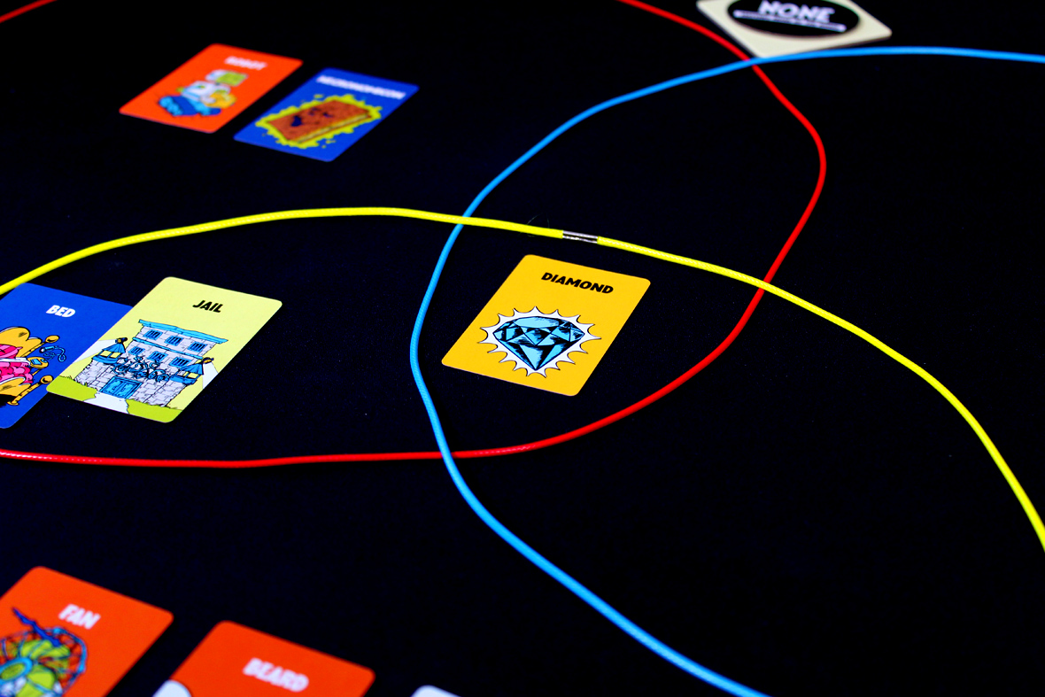 Over a given round, your goal is to play all your cards! That part’s pretty easy. On your turn, play a card from your hand to one of the sections that you think it belongs in. You can play to the overlapping sections. You can also play to the outside of the rings and say “I don’t think this belongs in any of these rings” to play None.