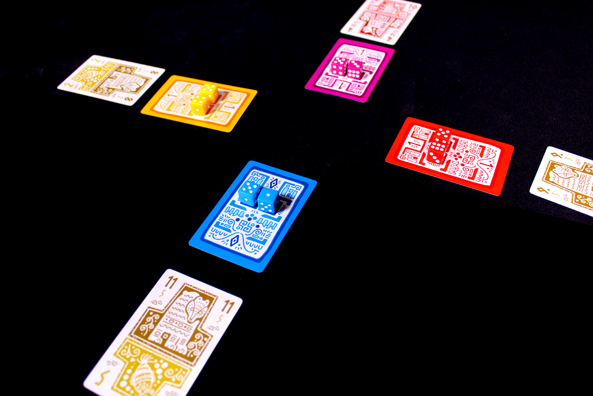 To start a round, each player rolls their dice until they get two different values. Once they have, set the dice on their score card. Those are their two target numbers for the round. One note: if you roll a 6, your target number can be 6 or 0. Your goal is to take a number of tricks equal to one of your target numbers.