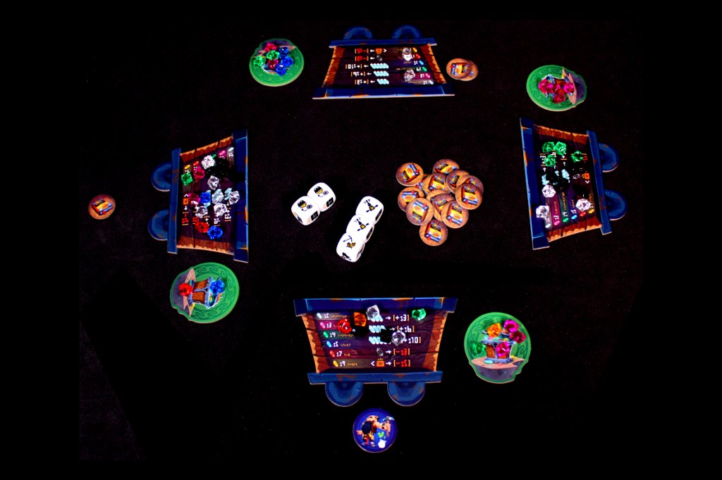 So, let’s. Quartz: The Dice Game strives for a very quick experience that you can get through in less than 30 minutes, even with six players, and I think it does a good job largely holding to that idea. I’ve played with a couple different player counts and found that the game moves at a good pace, largely because it’s dice-driven with a few actions. This can lead to some consternation for players, just because many of the actions require two matching dice to activate, so greedy players run the very-real risk of not being able to do a few things because they didn’t get the cards to work out in the way they wanted. I actually found this to be one of the more frustrating parts of the game just because there are just enough things to do on your turn that are helpful or good that you run the risk of being caught in between a few different ideas. Plus, there are diminishing returns! Doing two different actions means you usually waste two dice, rather than just one (since both usually require two dice to actually do anything). It’s a tough optimization problem, though that’s where some people have the most fun. The other thing to watch out for, here, is the take-that elements: there’s a lot of opportunity to gang up on players ranging from the Uninformed (going after the player with the most gems) to the Annoying (wasting game time counting everyone’s points so that you can better tune who you want to go after). Neither person is my favorite.