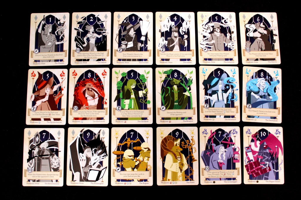 The top card of each deck is first to be played. Check for instant-activating effects, and then once those are resolved, generally, the higher number wins (or a card loses to a card of a type it’s Weak to). The losing Wizard is discarded; the winning Wizard stays in place. The loser reveals a new card and play continues!