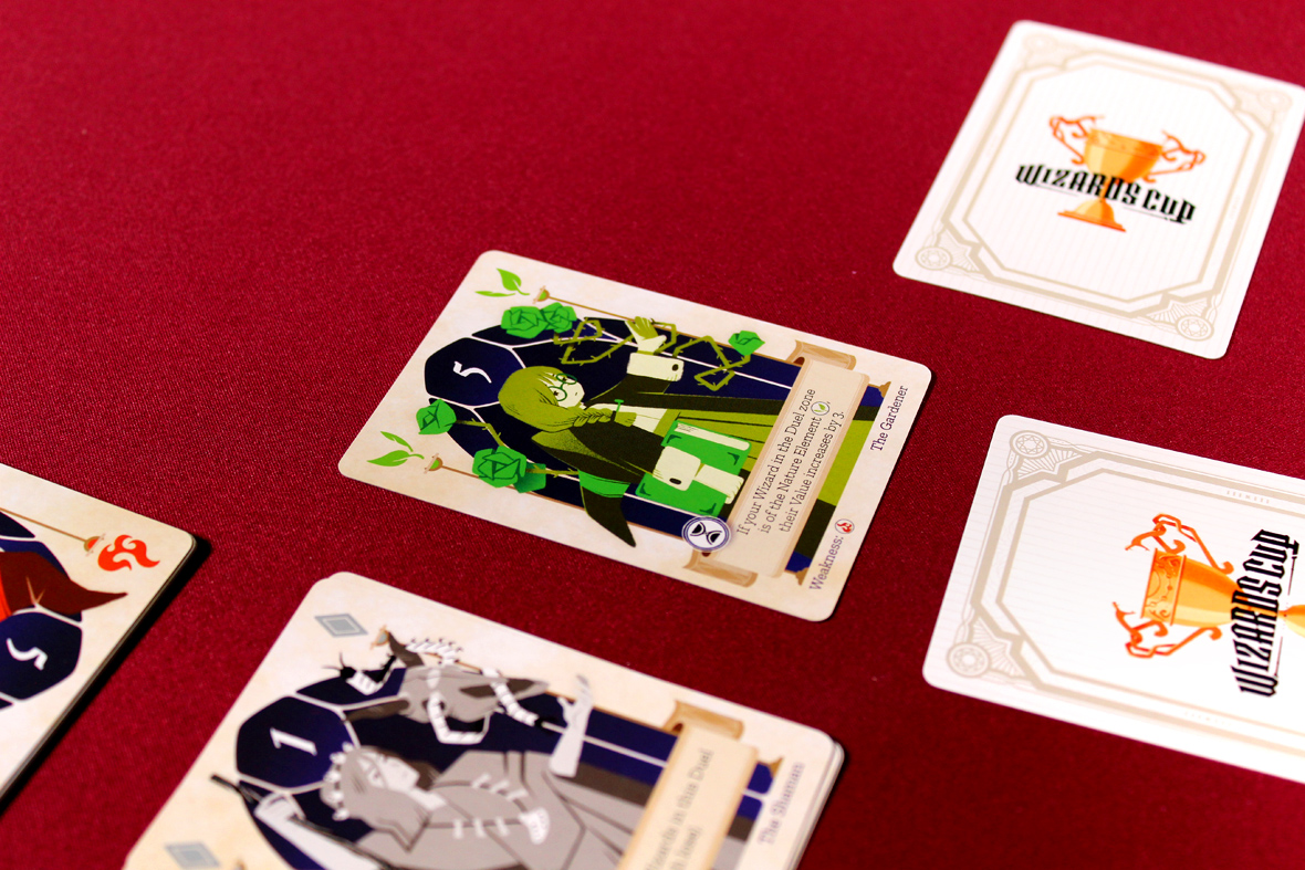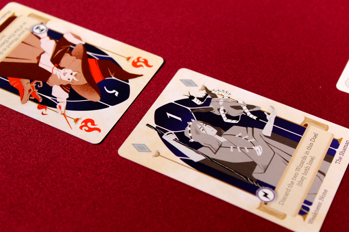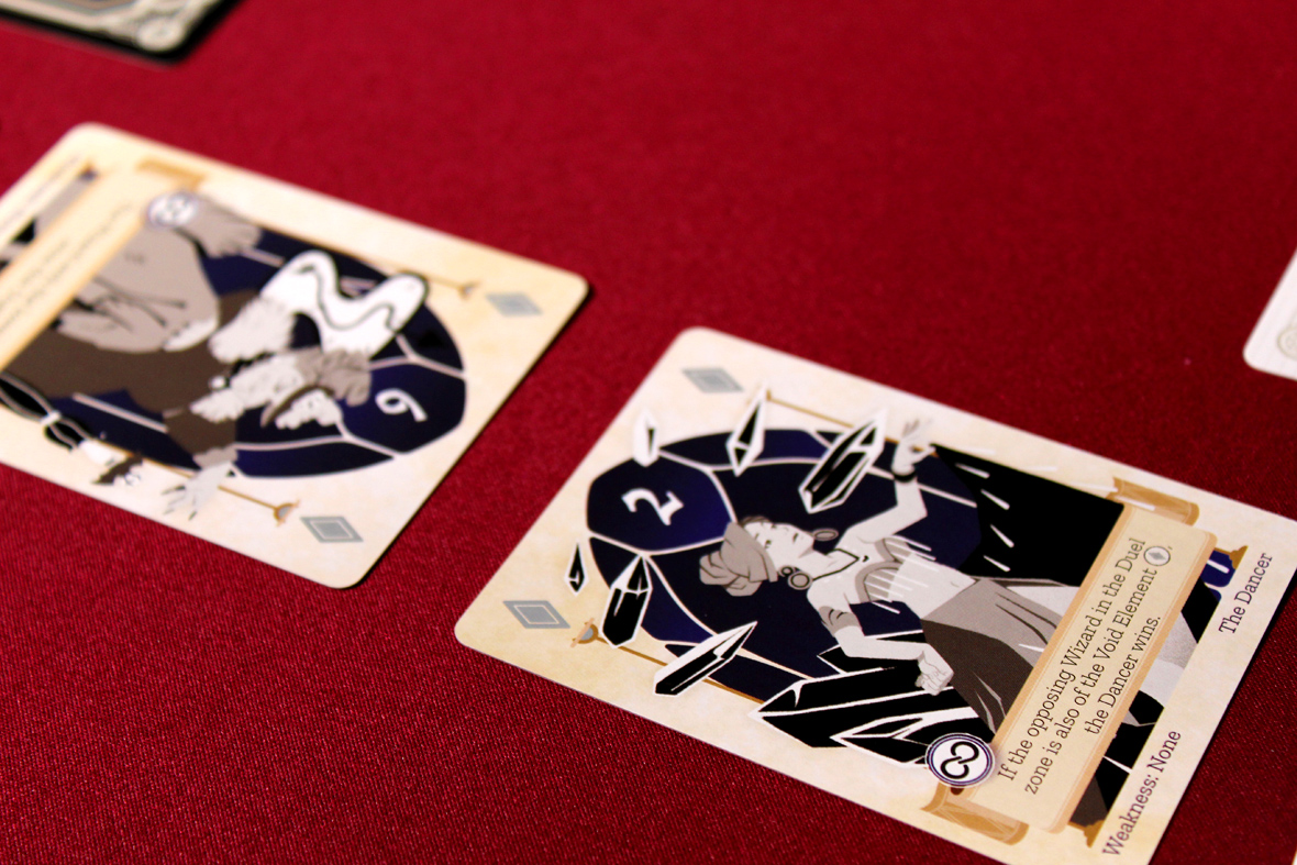 The top card of each deck is first to be played. Check for instant-activating effects, and then once those are resolved, generally, the higher number wins (or a card loses to a card of a type it’s Weak to). The losing Wizard is discarded; the winning Wizard stays in place. The loser reveals a new card and play continues!