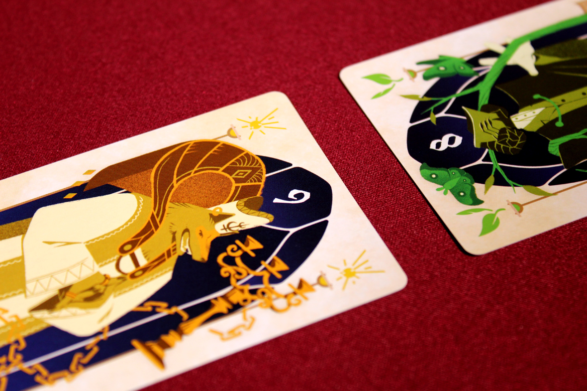 Once one player is out of cards, if the other player still has at least one card, they win! They take a Victory Token. If both players run out of cards at the same time, it’s a tie. Both players can then exchange a card in their set of six for any of the cards in their deck (just one, though) and then set the order of their cards and their Waiting Card. Once that happens, the next round begins!