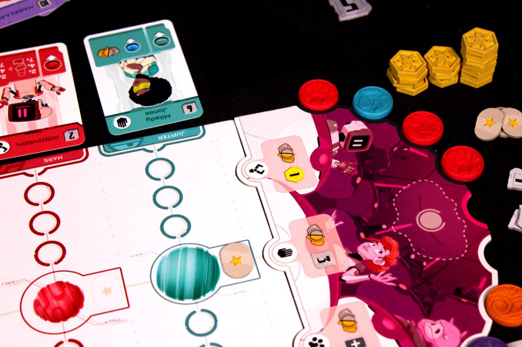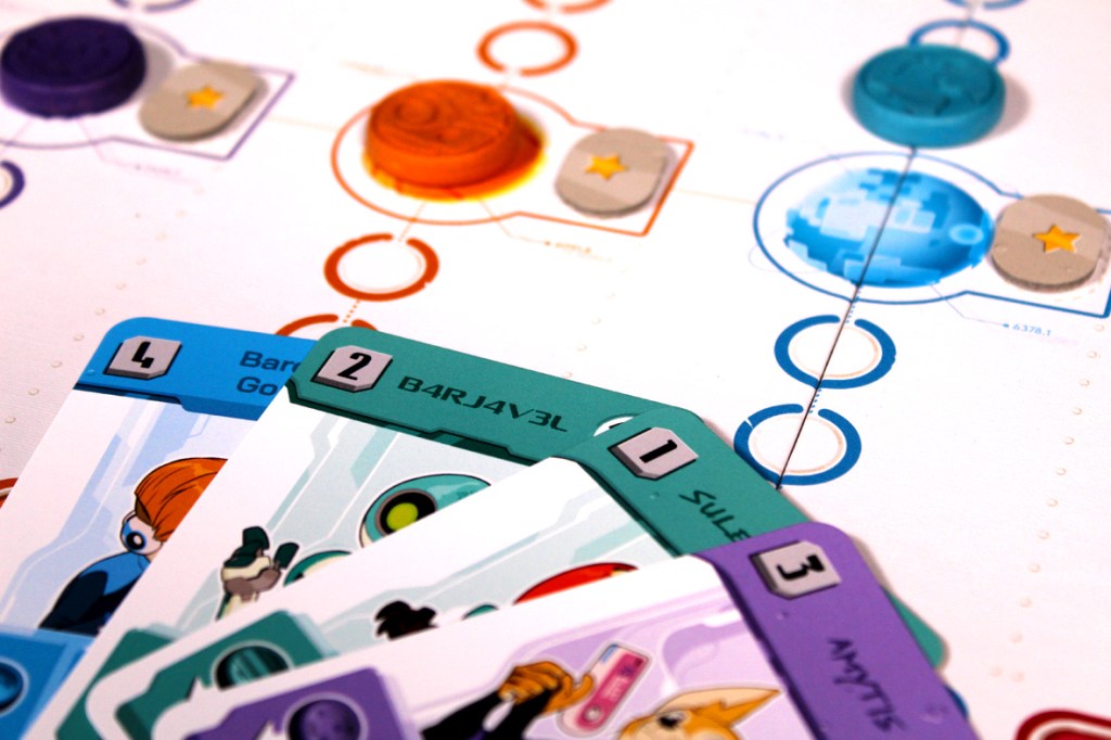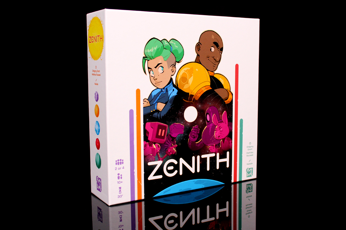 Overall, I think Zenith is a lot of fun! It’s definitely a more complicated game than Captain Flip (PlayPunk’s first title), but I think it builds on the two-player tug-of-war game genre in ways that are interesting and unexpected. For example, it’s got engine-building elements (in that playing cards of a color makes subsequent cards of that color cheaper) but it doesn’t particularly benefit you to know every card, which is really nice. Makes the game a lot more approachable. There are vague trends across the various planet colors and various group types, but they aren’t as pronounced as other games in this genre, either. What you end up with as a result is a game that feels informed by other games like it but deftly avoids their pitfalls. It’s even got a technology tree that’s super easy to use; the cost in Zenithium just gets more expensive each time you need to move up a track, which is also super easy to track. Plus, it feels awesome to activate a track at the fifth level and also activate levels four, three, two, and one. It’s a good idea.