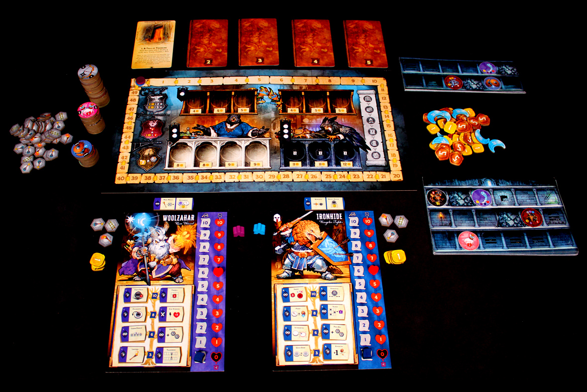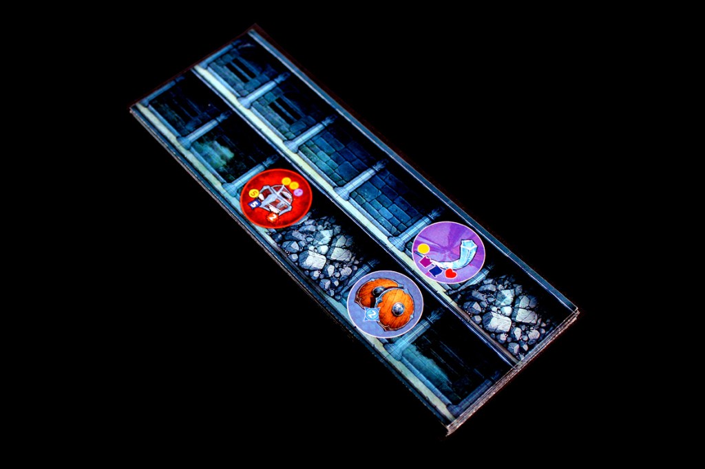 The Tavern and the Village come next! At the Tavern, each player gets 2 coins or 1 health for each mug between them and the leader. At the Village, each player gets three turns to potentially look at chips and buy them from the Village! They don’t refill unless you spend a tool and use one of your Browse actions. You can gain additional chips to try and fill holes in your strategy and better synergize with your skills. It’s useful! After everyone’s finished shopping, it’s time to delve again!