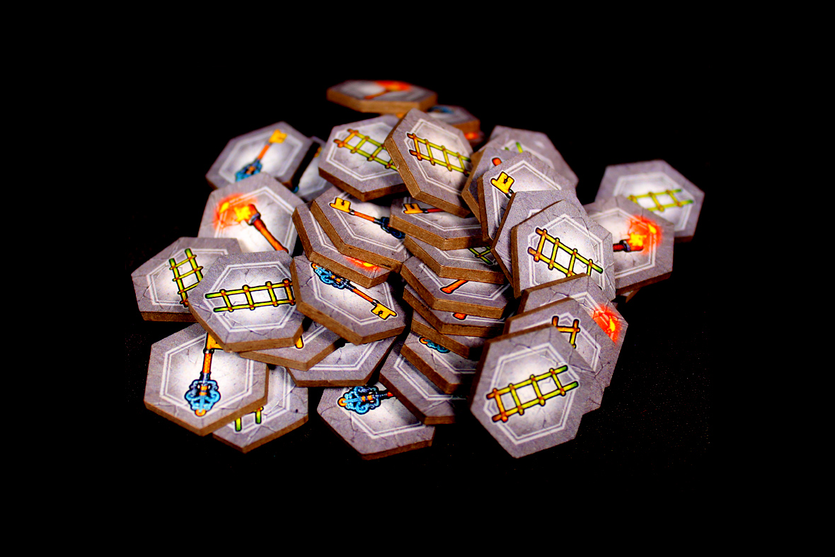 You play a game over five rounds. Each round starts the same! You’ll draw a Dungeon Map from the bottom of the stack and then pick a side. Then, start drawing chips one at a time! Each chip has two sides, and you can place them in the current row on any unobstructed space. Some obstructions are fallen rocks, and others are pre-existing red-lined chips. Once you fill a row, you can move on! You can also use torches to skip a chip, ladders to move down a level, and keys to meet requirements on chests.