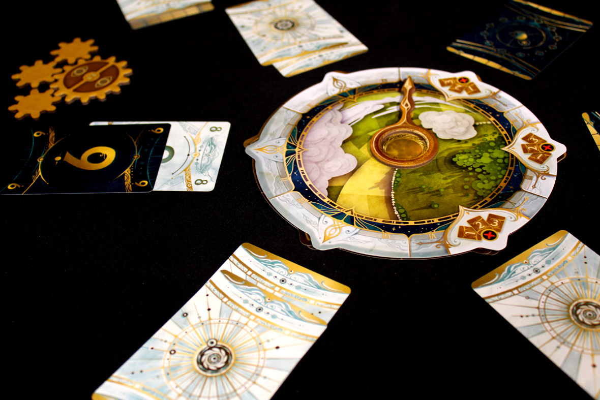 Gameplay is simple. There are six segments, each of which need to have at least one card played to them. Here’s the challenge: most of your cards (numbered 1 – 12 in Solar and Lunar) have to be played face-down and you can’t talk to your teammates. So you have to learn and figure out what they’re going to play so you can help get across the goal line.
