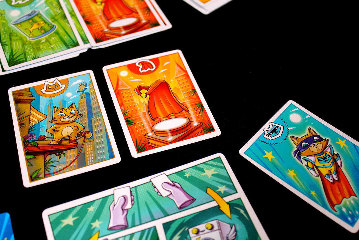Welcome to deckbuilding with Super Meow! This is a kid-friendly deckbuilder intended to show novice players the ropes and teach some basic strategy. Think a lighter Abandon All Artichokes, with a vaguely similar win condition. Here, your goal is simple. On your turn, reveal both a Cat card and a Cape card to rescue Super Meow and win!