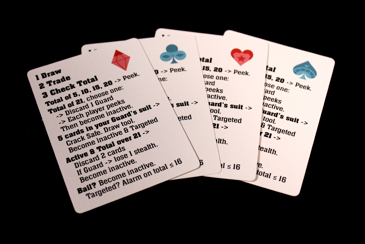 If you have five cards of the same suit as your guard / player aid card in your display, you’ve cracked your safe! You draw a Tool and switch your character to the Targeted side. More on that later. Now your new goal is just to survive!