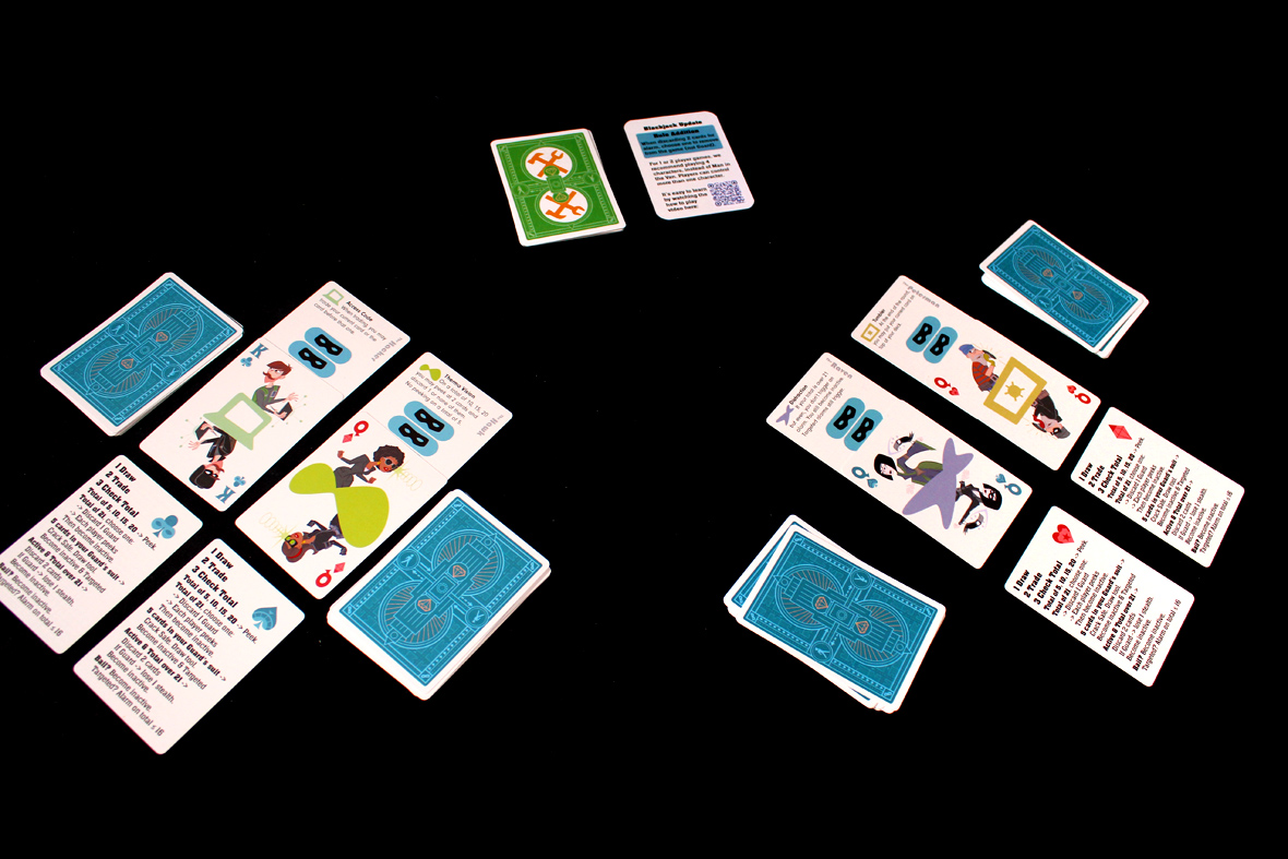 The general idea stays the same regardless of player count. With one or two, you’ll play four- or two-handed. Simple enough! The actual gameplay remains the same, you just control four players or two players. At three players, you have The Man in the Van! He doesn’t really play, per se; he just draws a card every turn. If it’s a Jack, any player can discard a Guard (Jack) in their display. You can trade with his current card, as well, but otherwise he discards it every turn. It mostly compensates for having an extra player who could get 21s. There’s not a huge difference, otherwise. I’ve played it a lot at two, and enjoyed it.