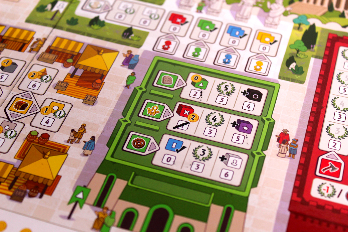 - The gold building is definitely context-dependent. You get immediate money (for the right side) based on how many spaces of that type you’ve checked off. You also get points at the end of the game. Endgame points are good, but if you cross those spaces off too early, you’re not really getting any money for them.