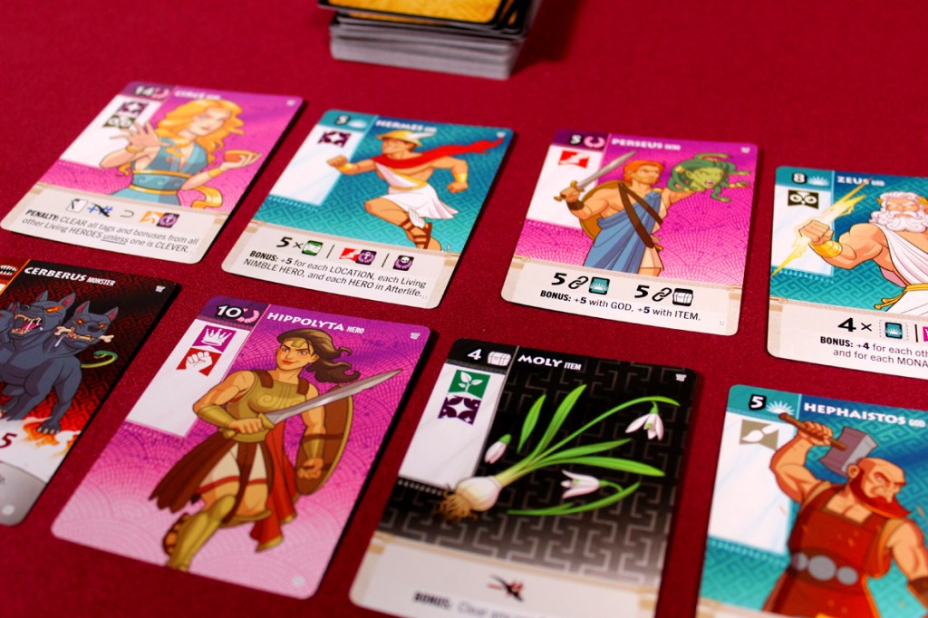 In Fantasy Realms: Greek Legends, players dive deep into Greek mythology to see what combos they can produce! Like the classic Fantasy Realms, each turn is simple: draw a card and discard a card, trying to come up with the best seven-card combo that you can play. The twist is that this time, much like the mythology in question, the afterlife isn’t completely off-limits. People come and go all the time! Orpheus, problematically, among others. Your Afterlife here is a new place for you to discard cards to. For the most part, they’re still readily accessible, but that comes at a cost: at the end of the game, you lose 10 points for every card in your Afterlife! Sometimes it’s better to be alive, I suppose. Not that it matters to some of these characters. So gather your heroes, your gods, your monsters, and just an unbelievable amount of stuff and try to transcend the myth and become a legend. Do you have what it takes to spin your own tale?